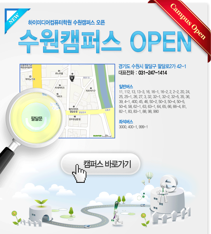 [종료] 수원캠퍼스 오픈하였습니다. 2010.11.15 하이미디어컴퓨터학원 수원캠퍼스 오픈 기념 이벤트 1. 수강료 할인 40%~30%할인 : 오픈 기념 행사기간 접수하시는 모든분들께 특별할인을 해드립니다. 2. 온라인 동영상 강좌 무료수강 : 애듀패스 온라인 강좌 3개월 VIP무료수강을 하실 수 있습니다.